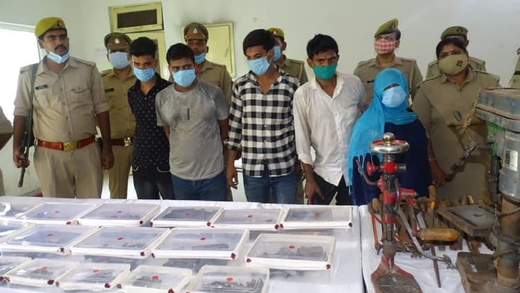 एसएसपी पवन कुमार (SSP Pawan Kumar) ने बताया कि 32 बोर की पांच पिस्तौल, 72 कारतूस, 20 अर्धनिर्मित पिस्तौल, 32 बोर की 55 नलियां, 13 मैगजीन, 250 मैगजीन स्र्पिंग, 10 अर्धनिर्मित मैगजीन, 90 साइड प्लेट, 17 ट्रिगर गार्ड और हथियार निर्माण में इस्तेमाल होने वाले उपकरण मौके से बरामद किए गए हैं. आरोपियों की पहचान बिहार के मुंगेर निवासी मोहम्मद मुस्तफा, मुरादनगर निवासी सलाम और कैफी आजम, मेरठ निवासी सलमान और मेरठ की ही रहने वाली महिला असगरी के तौर पर हुई है.