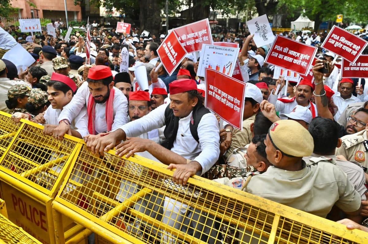 Akhilesh Yadav News: दिल्ली में इंडिया गठबंधन के चुनाव आयोग मार्च में नाटकीय दृश्य दिखे, जब अखिलेश यादव पुलिस बैरिकेड कूद गए. राहुल और प्रियंका गांधी को पुलिस ने हिरासत में लिया. मार्च 2024 लोकसभा चुनाव में कथित ‘वोट चोरी’ और बिहार में मतदाता सूची गड़बड़ी के विरोध में किया गया.