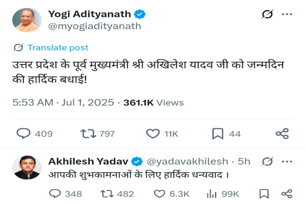 राजनीतिक मतभेदों से इतर मुख्यमंत्री योगी आदित्यनाथ ने भी अखिलेश यादव को जन्मदिन की शुभकामनाएं दीं. उन्होंने सोशल मीडिया प्लेटफॉर्म एक्स पर पोस्ट करते हुए लिखा, “उत्तर प्रदेश के पूर्व मुख्यमंत्री अखिलेश यादव को जन्मदिन की हार्दिक बधाई.” इस पर अखिलेश यादव ने भी तत्काल जवाब देते हुए सीएम योगी के प्रति आभार जताया.