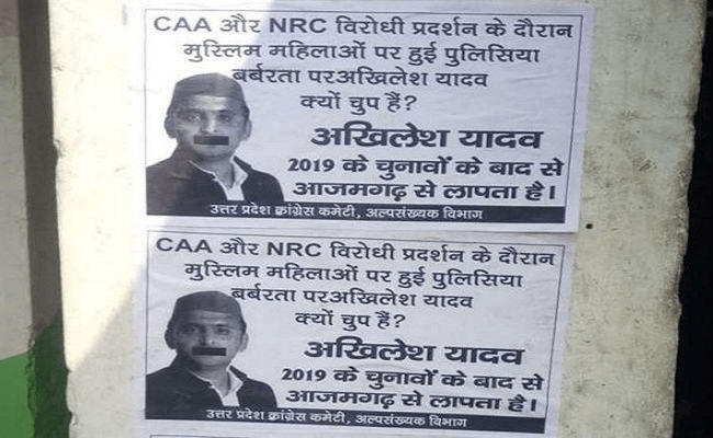 आजमगढ़ : उत्तर प्रदेश के आजमगढ़ जिले के बिलरियागंज में सीएए और एनआरसी के खिलाफ पिछले दिनों प्रदर्शन कर रही महिलाओं के विरुद्ध पुलिस की कार्रवाई को लेकर सियासत तेज हो गयी है. कांग्रेस ने क्षेत्रीय सांसद एवं सपा अध्‍यक्ष अखिलेश यादव पर इस मामले में खामोशी अख्तियार करने का आरोप लगाते हुए जगह-जगह उनके ‘लापता’ होने के पोस्‍टर लगवाये हैं.