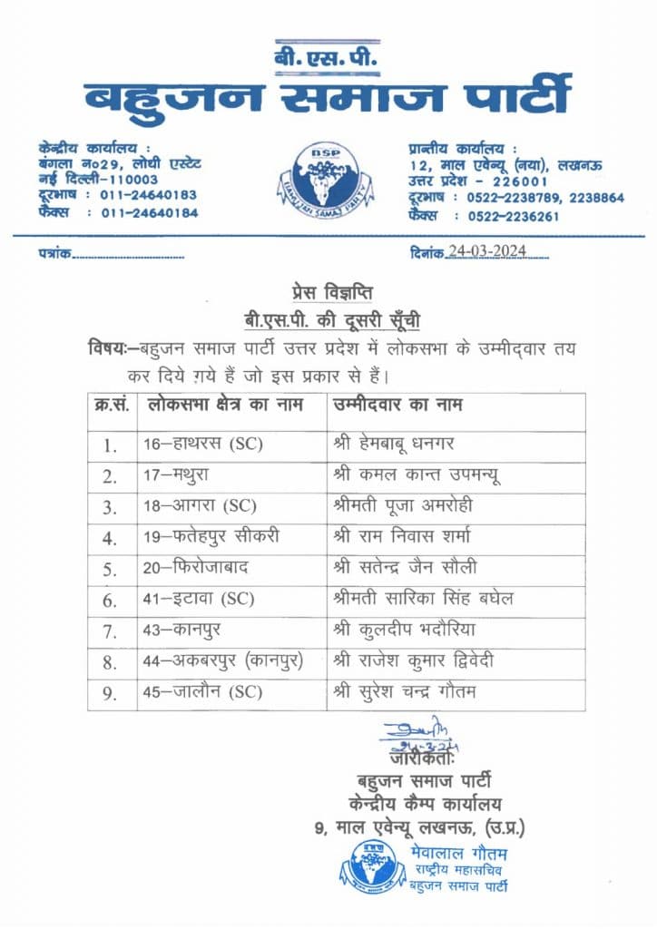 Lok Sabha Election 2024: BSP ने 9 उम्मीदवारों की दूसरी सूची जारी की, कानपुर से कुलदीप भदौरिया को टिकट