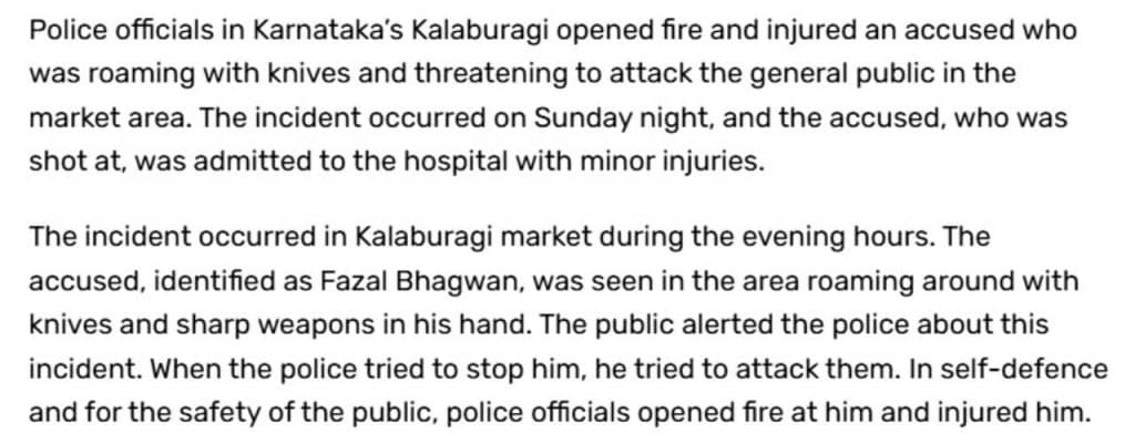 इंडिया टुडे में छपी खबर में घटना रविवार रात को कलबुर्गी की बताई गई. इसके अनुसार, आरोपी की पहचान फजल के रूप में हुई है. आरोपी मार्केट में चाकू लेकर घूम रहा था. लोगों ने इसकी सूचना पुलिस को दी. वहां पहुंचे पुलिस अधिकारी ने उस पर गोली चला दी, जिससे वह घायल हो गया.