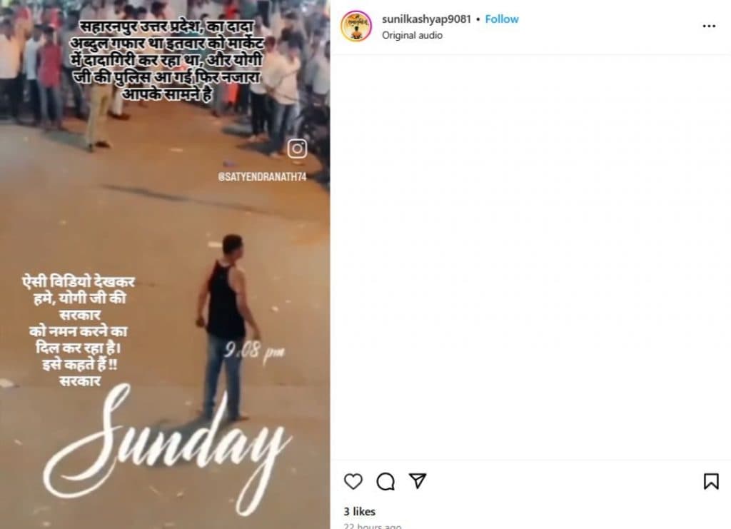इंस्टा यूजर sunilkashyap9081 ने 12 दिसंबर को वीडियो को शेयर (आर्काइव लिंक) किया है. इस पर लिखा है, “सहारनपुर उतर प्रदेश का दादा सहारनपुर अब्दुल गफ्फार था इतवार को मार्केट में दादागिरी कर रहा था, और योगी जी की पुलिस आ गई फिर नजारा आपके सामने है.“