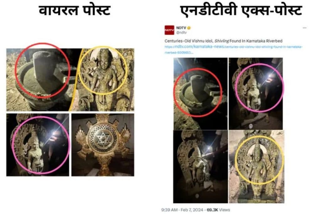 वायरल कोलाज में मौजूद तस्वीरों पर रिवर्स इमेज सर्च करने पर हमें एनडीटीवी (आर्काइव यहां) द्वारा 7 फरवरी 2024 को पोस्ट किया गया एक एक्स-पोस्ट मिला. कैप्शन में लिखा है, ‘कर्नाटक के नदी के किनारे सदियों पुरानी विष्णु की मूर्ति और शिवलिंग मिला.’ इसमें दिख रही 3 तस्वीरें वर्तमान में वायरल हो रही तस्वीरों से मेल खाती हैं.