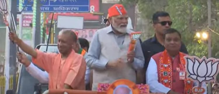 लखनऊ: पीएम नरेंद्र मोदी का (Lok Sabha Election 2024) गाजियाबाद में रोड शो के दौरान स्थानीय लोगों ने भव्य स्वागत किया. तय समय पर शाम 5.30 बजे पीएम मोदी (PM Narendra Modi) ने गाजियाबाद में मालीवाड़ा से विशेष खुले वाहन में रोड शो किया. पीएम मोदी के साथी सीएम योगी आदित्यनाथ व गाजियाबाद से सांसद प्रत्याशी अतुल गर्ग भी थे. हाथ में बीजेपी का चुनाव चिन्ह कमल को लिए सभी जनता का अभिवादन कर रहे थे. सड़क के दोनों तरफ लोग पीएम मोदी को देखने के लिए जुटे थे. जगह-जगह उन पर फूल बरसाए गए. महिलाओं की टोलियों ने स्वागत किया. बैंड व ढोल बजाते लोग लगातार मोदी-मोदी के नारे लगा रहे थे.