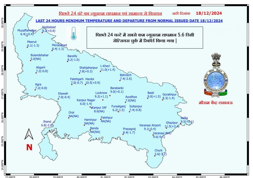 मौसम विभाग के आंकड़ों के मुताबिक बीते 24 घंटों में सबसे कम तापमान चुर्क में दर्ज किया गया. चुर्क में 5.6 डिग्री सेल्सियस न्यूनतम तापमान दर्ज किया गया. यह औसत न्यूनतम तापमान से 3.2 डिग्री सेल्सियस कम है. वहीं, राजधानी लखनऊ में न्यूनतम तापमान 9.2 डिग्री सेल्सियस दर्ज किया गया है. वहीं बहराइच में सबसे कम ठंड रिकॉर्ड किया गया है. बहराइच में अधिकतम तापमान 27.4 डिग्री सेल्सियस रिकॉर्ड किया गया है.