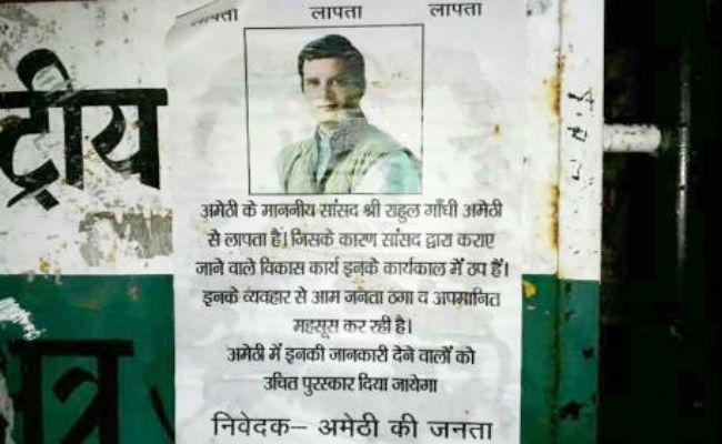 अमेठी : कांग्रेस उपाध्यक्ष राहुल गांधी के संसदीय क्षेत्र अमेठी में उनकी गुमशुदगी के पोस्टर चस्पाये गये हैं. कांग्रेस ने इसे भाजपा और राष्ट्रीय स्वयंसेवक संघ की साजिश करार देते हुए मुकदमा दर्ज कराने की बात कही है. अमेठी में जगह-जगह चिपकाये गये पोस्टर में लिखा है कि ”राहुल लापता हैं, जिसके कारण क्षेत्र का विकास ठप है. उनके व्यवहार से आम जनता ठगा तथा अपमानित महसूस कर रही है. अमेठी में इनकी (राहुल की) जानकारी देने वालों को उचित पुरस्कार दिया जायेगा.” पोस्टर में निवेदक की जगह ‘अमेठी की जनता ‘ लिखा गया है. हालांकि, इसमें प्रकाशक और मुद्रक का नाम नहीं है.