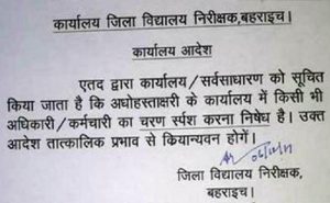 बहराइच : जिले के शिक्षा विभाग के एक अधिकारी ने अपने कार्यालय में किसी भी अधिकारी और कर्मचारी के पैर छूने पर रोक लगाने के लिखित आदेश जारी किये हैं. उक्त आदेश नोटिस बोर्ड पर चस्पा किये जाने की खबर सोशल मीडिया वाइरल हो गयी है. बहराइच में राजेंद्र प्रसाद पांडेय जिला विद्यालय निरीक्षक के पद पर तैनात हैं. हाल ही में उन्होंने अपने कार्यालय के नोटिस बोर्ड पर तत्काल प्रभाव से लागू होने वाला एक आदेश चस्पा कराया, जिसमें लिखा था कि ‘‘कार्यालय में किसी भी अधिकारी/ कर्मचारी का चरण स्पर्श करना निषेध है.’