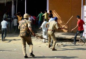 जिलाधिकारी कौशल राज शर्मा ने पत्रकारों से कहा कि दुर्गा मां के एक भंडारे का पोस्टर जमीन पर गिरा पाया गया. इस पर एक पक्ष ने दूसरे पर आरोप लगाया कि उनके जुलूस के दौरान इसे कथित तौर पर गिराया गया. उन्होंने कहा कि इस बात को लेकर दोनों पक्षों में असंतोष फैल गया जिसके बाद आज दोपहर दोनों पक्षों की बैठक बुलाकर उनके बीच सुलह भी करा दी गई. शर्मा ने कहा कि समझौता होने के बाद पहले पक्ष के 100-150 लोगों ने नारेबाजी की और कथित तौर पर पथराव किया. इस पर काबू पाने के लिए पुलिस को लाठीचार्ज करना पडा और भीड को तितर-बितर करने के लिए आंसू गैस के गोले छोडे.