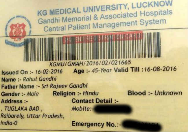 केजीएमयू में मरीज का ओपीडी कार्ड कई तरह की जानकारियों को एक फॉरमेट पर डालने के बाद बनता है. बनने के बाद जो कार्ड मिलता है, उस पर एक बारकोड होता है. इस बारकोड के जरिये मरीज का पूरा डेटा केजीएमयू के सिस्टम पर चेक किया जा सकता है. इस कार्ड में मरीज का नाम राहुल गांधी, पिता का नाम श्री राजीव गांधी,पता तुगलकाबाद, रायबरेली उत्तर प्रदेश, उम्र 45 साल, ब्लड ग्रुप अज्ञात दर्ज किया गया है.