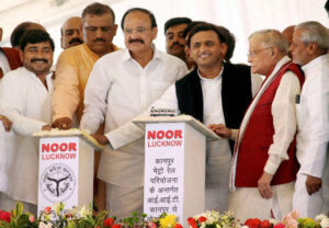 उन्होंने कहा कि पहले लैपटॉप बांटे थे जिससे बहुत लोग लाभान्वित हुये लैपटॉप जब खुलता तो हमारा और मुलायम सिंह जी का चेहरा दिखता है. इस बात को जनता याद रखेगी. अखिलेश का इशारा आगामी विधानसभा चुनाव में समाजवादी पार्टी को याद रखने का था. उत्तर प्रदेश के मुख्यमंत्री अखिलेश यादव आज कानपुर में मेट्रो ट्रेन के उद्घाटन समारोह में बोल रहे थे. अपने निर्धारित समय से करीब एक घंटे की देरी से शहर के पालिका स्टेडियम में पहुंचे मुख्यमंत्री अखिलेश यादव और केंद्रीय शहरी विकास और सूचना प्रसारण मंत्री वेकैंया नायडू ने बटन दबाकर मेट्रो ट्रेन का शिलान्यास किया. उन्होंने बताया कि करीब 32 किलोमीटर की इस मेट्रो ट्रेन चलो की योजना में 17 हजार करोड़ से अधिक की लागत आयेगी. यह योजना दो चरणों में होगी. योजना का पहला चरण आईआईटी कानपुर से नौबस्ता तथा दूसरा चरण एग्रीकल्चरल यूनिवर्सिटी से नौबस्ता के बीच होगा. इस परियोजना के लिये उत्तर प्रदेश सरकार ने पचास करोड़ रुपये की धनराशि जारी कर दी है.