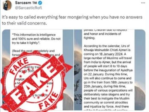 दरअसल, सोशल मीडिया पर सार्केज़म टीएम नाम के एक ट्वीटर हैंडल से दावा किया गया कि कैलेंडर के अनुसार अजमेर में ख्वाजा मोइनुद्दीन चिश्ती का उर्स 18 जनवरी से शुरू हो रहा है. ऐसे में भारत के कोने-कोने से विशेष समुदाय के लोग अजमेर जाने की तैयारी में है. लेकिन इसी बीच अयोध्या में होने वाला प्राण प्रतिष्ठा समारोह 22 जनवरी को होगा. इसके चलते हिंदू समुदाय के लोग 10 दिन पहले से ही अयोध्या की यात्रा करेंगे ताकि इस समारोह में शामिल हो सकें. यात्रा के दौरान बहुत सारे हिंदू समुदाय के धार्मिक संस्थान और श्रद्धालु भजन करेंगे और उद्घोष लगाएंगे. इसी बीच दूसरे समुदाय के लोगों को दिक्कतों का सामना करना पड़ सकता है. इसके चलते इस समुदाय के लोग जो सरकारी एवं निजी क्षेत्र में नौकरी करते हैं उन्होंने 19 से 26 जनवरी तक अवकाश लिया है. साथ ही बहुत सारे इस समुदाय के लोग जो अजमेर शरीफ जाने का प्लान बनाया था उन्होंने इसे कैसिंल कर दिया है. जिसके चलते भारतीय रेल द्वारा चलाए जा रहे उर्स स्पेशल ट्रेनें खाली जा रही हैं. वहीं इस समुदाय के बहुत सारे व्हाट्सएप ग्रुप में इन दिनों घर से बाहर न निकलने की हिदायत दी जा रही हैं. इस पर अयोध्या पुलिस ने ट्वीट कर कहा कि यह जानकारी भ्रामक है. अगर कोई भी व्यक्ति ऐसी भ्रामक जानकारी सोशल मीडिया पर शेयर करता है तो उसके खिलाफ कानूनी कार्यवाही की जाएगी.