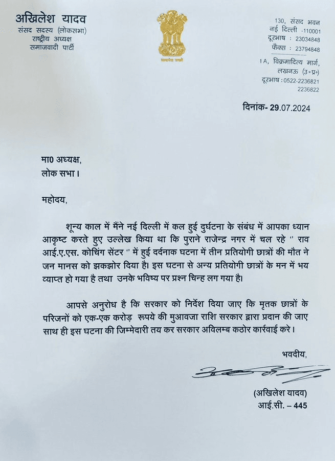 Delhi IAS Coaching: आईएएस कोचिंग में मृत छात्रों के परिजनों को एक-एक करोड़ मुआवजा दें, अखिलेश यादव ने लिखा पत्र