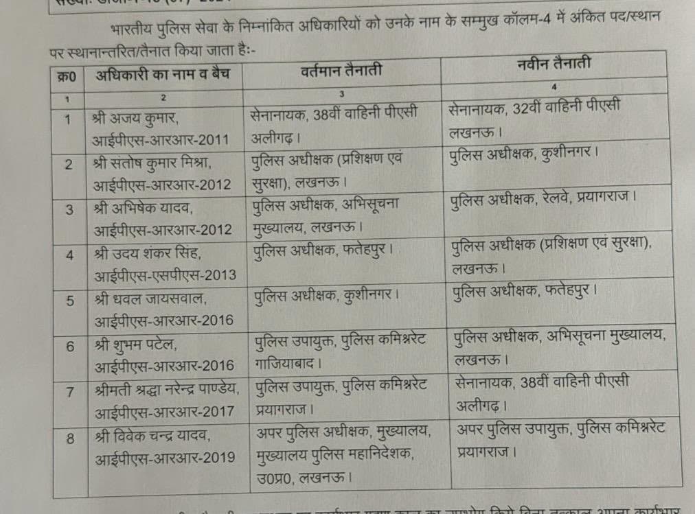 पुलिस अधीक्षक अभिसूचना मुख्यालय के पद पर तैनात अभिषेक यादव को पुलिस अधीक्षक रेलवे प्रयागराज बनाया गया है. शुभम पटेल को पुलिस उपायुक्त पुलिस कमिश्नरेट गाजियाबाद से पुलिस अधीक्षक अभिसूचना मुख्यालय बनाया गया है. श्रद्धा नरेंद्र पांडेय को पुलिस उपायुक्त पुलिस कमिश्नरेट प्रयागराज से सेनानायक 38वीं वाहिनी पीएसी अलीगढ़ के पद पर भेजा गया है. पुलिस अधीक्षक फतेहपुर उदय शंकर सिंह को पुलिस अधीक्षक प्रशिक्षण एवं सुरक्षा बनाया गया है. सेनानायक 38वीं वाहिनी पीएसी अलीगढ़ अजय कुमार को सेनानायक 32वीं वाहिनी पीएसी लखनऊ के पद पर भेजा गया है.