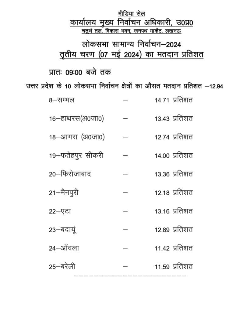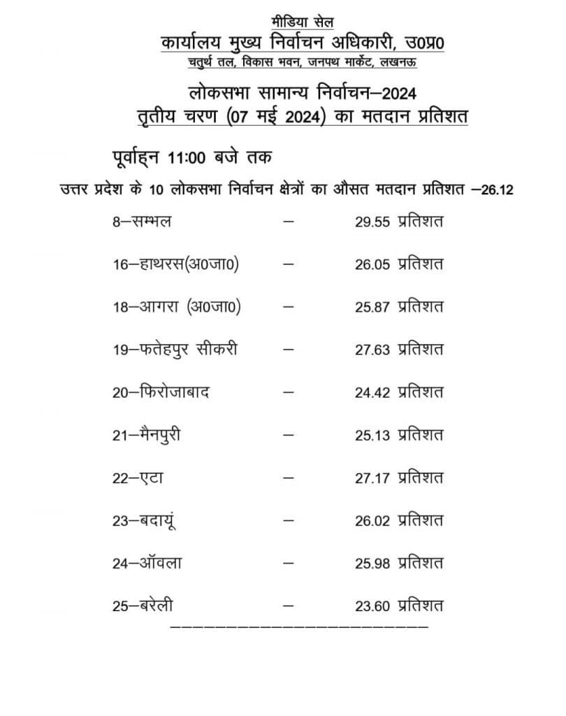दोपहर एक बजे तक संभल में 42.97 प्रतिशत, हाथरस में 37.89 प्रतिशत, आगरा में 36.89 प्रतिशत, फतेहपुर सीकरी में 39.09 प्रतिशत, फिरोजाबाद में 40.06 प्रतिशत, मैनपुरी में 38.32 प्रतिशत, एटा में 39.87 प्रतिशत, बदायूं में 34.97 प्रतिशत, आंवला में 36.95 प्रतिशत, बरेली कमें 34.93 प्रतिशत मतदान हुआ है.