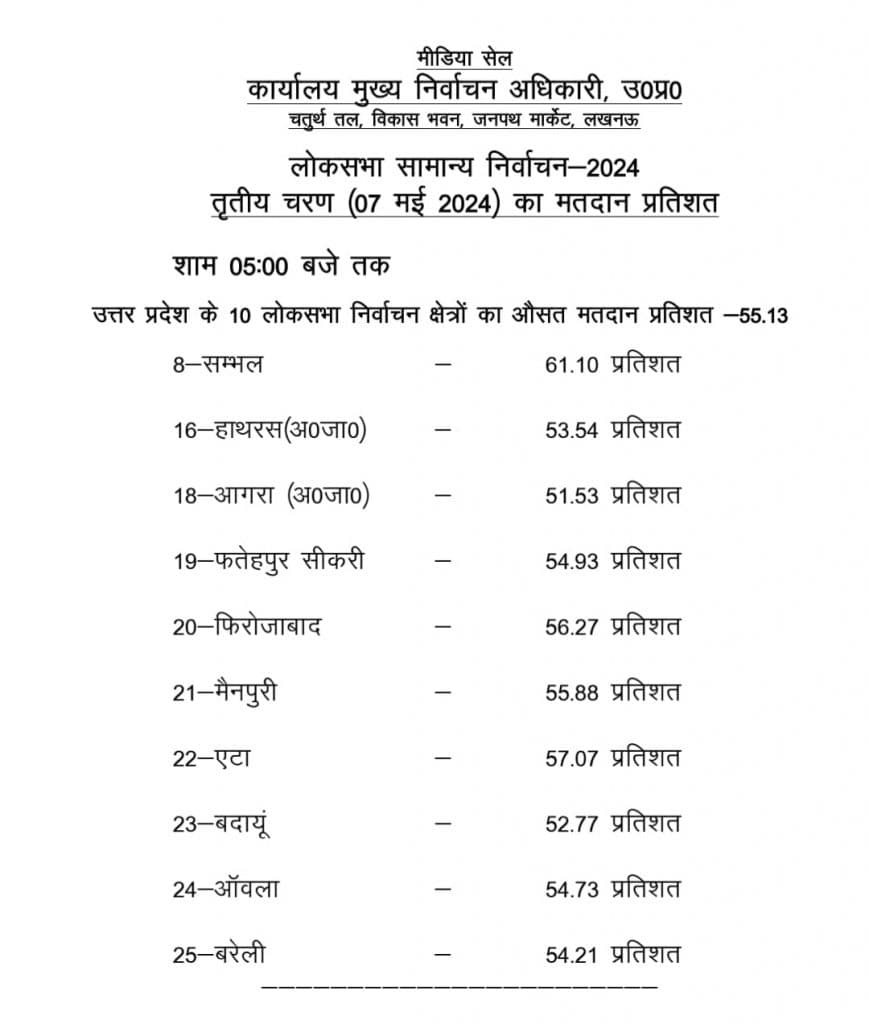 चुनाव आयोग के अनुसार शाम 5 बजे तक संभल में 61.10 प्रतिशत, हाथरस में 53.54 प्रतिशत, आगरा में 51.53 प्रतिशत, फतेहपुर सीकरी में 54.53 प्रतिशत, फिरोजाबाद में 56.27 प्रतिशत, मैनपुरी में 55.88 प्रतिशत, एटा में 57.07 प्रतिशत, बदायूं में 52.77 प्रतिशत, आंवला में 54.73 प्रतिशत, बरेली में 54.21 प्रतिशत मतदान हुआ है.