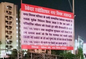 नगर निगम परिवार के सभी सम्मानित ठेकेदार भाइयों से नम्रतापूर्वक निवेदन किया जाता है कि हम सभी के पारिवारिक त्योहार को देखते हुए यदि दीपावली से पहले 20 अक्टूबर तक सामूहिक भुगतान नहीं किया जाता है तो हम समस्त कार्य जो कि पैच मरम्मत और पार्कों आदि किसी भी प्रकार का हो, का पूर्ण रूप से बंद करके दिनांक 22 अक्टूबर से धरने पर बैठने का कार्य करेंगे.