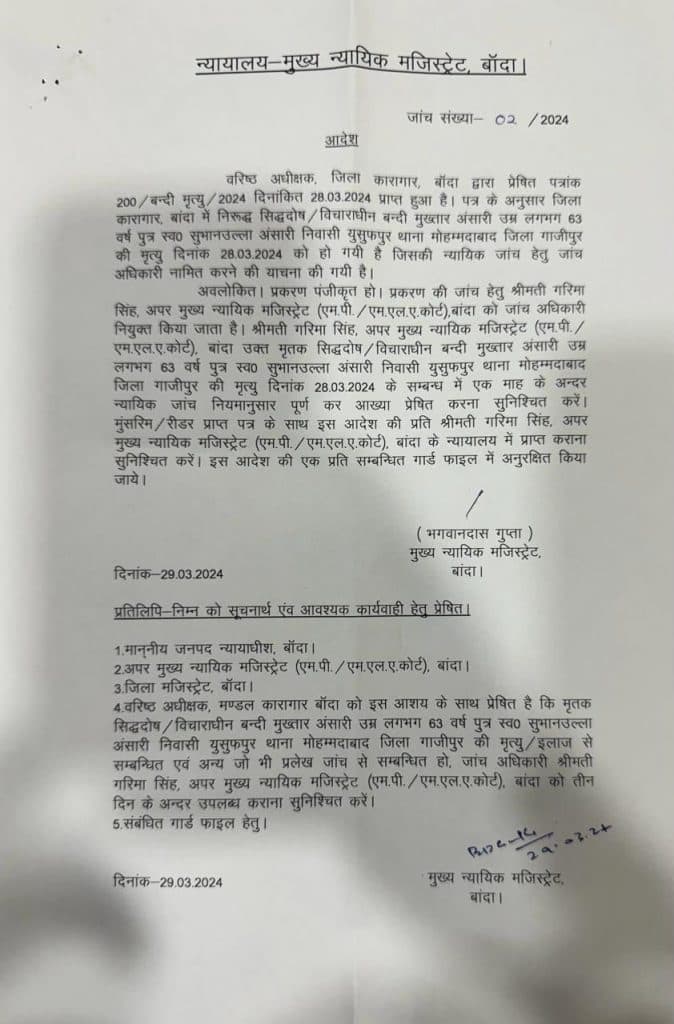 उधर मुख्तार अंसारी की मौत के मामले में CJM बांदा ने जांच के आदेश दिए हैं. सीजेएम कोर्ट ने अपर मुख्य न्यायिक मजिस्ट्रेट गरिमा सिंह को जांच अधिकारी बनाया है. उन्हें जांच रिपोर्ट एक माह के अंदर देने के निर्देश दिए गए हैं. मुख्तार की मौत के मामले में सपा, बसपा, कांग्रेस सहित कई बड़े नेताओं ने जांच की मांग की थी.