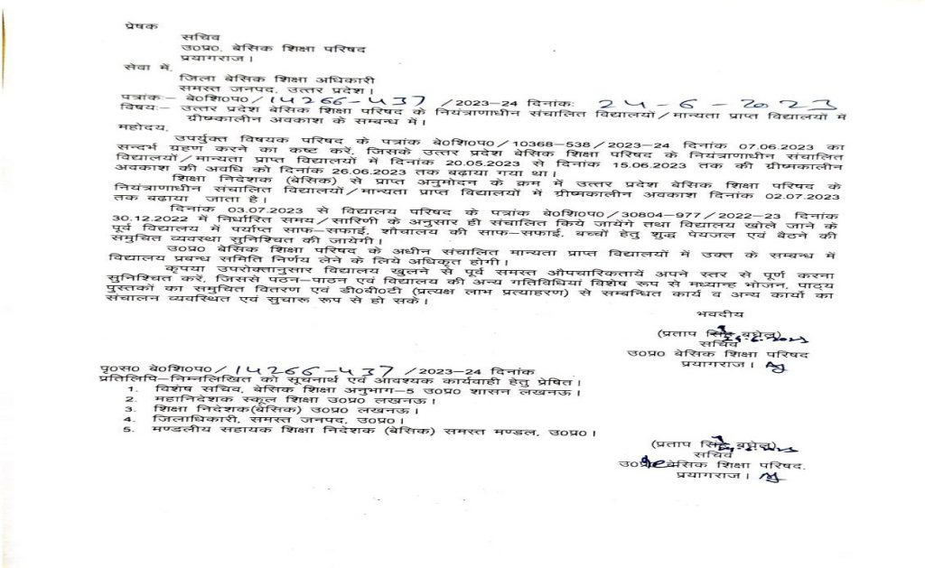 उत्तर प्रदेश बेसिक शिक्षा परिषद के नियंत्राणाधीन संचालित विद्यालय और मान्यता प्राप्त विद्यालयों में 20 मई से दिनांक 15 जून तक की ग्रीष्मकालीन अवकाश घोषित किए गए थे. सात जून सचिव के स्तर से आदेश जारी कर अवकाश की इस अवधि को 26 जून तक बढ़ा दिया गया. शिक्षा निदेशक (बेसिक) ने के अनुमोदन के बाद ग्रीष्मकालीन अवकाश 02 जुलाई तक विस्तारित कर दिया गया है.