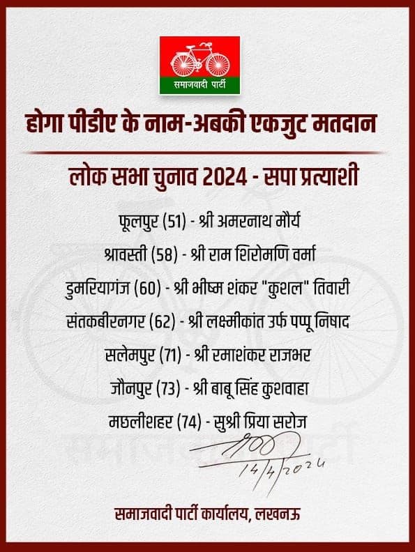 सुल्तानपुर से भीम निषाद, इटावा से जितेंद्र दोहरे, जालौन से नारायण दास अहिरवार, मिश्रिख मनोज कुमार राजवंशी, गाजीपुर से अफजाल अंसारी, मोहनलालगंज से आरके चौधरी, मुजफ्फर नगर से हरेंद्र मलिक, आंवला से नीरज मौर्य, हरदोई से ऊषा वर्मा, शाहजहांपुर से नीरज मौर्य, प्रतापगढ़ से एसपी सिंह पटेल, बहराइच से रमेश गौतम, गोंडा से श्रेया वर्मा, चंदौली से वीरेंद्र सिंह, बदायूं से चाचा शिवपाल सिंह यादव, कैराना से इकरा हसन, बरेली से प्रवीण सिंह एरन, हमीरपुर से अजेंद्र सिंह राजपूत प्रत्याशी घोषित कर चुकी है.