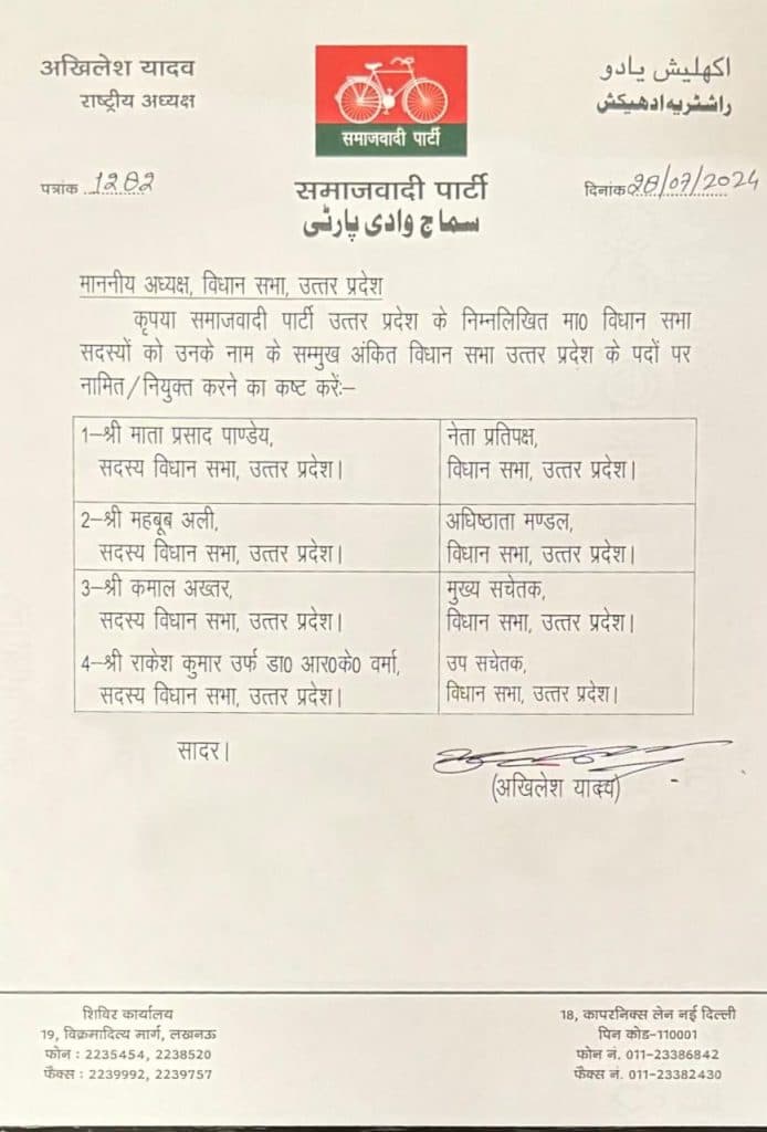 Samajwadi party: माता प्रसाद पांडेय बने नेता प्रतिपक्ष, महबूब अली अधिष्ठाता मंडल, कमाल अख्तर मुख्य सचेतक