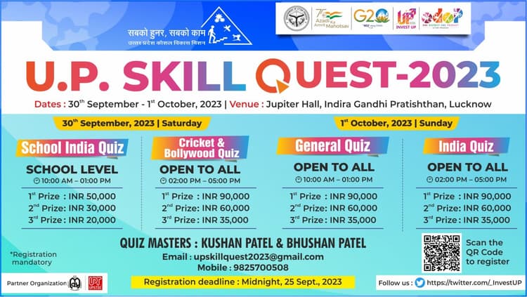 लखनऊ: उत्तर प्रदेश कौशल विकास मिशन (UPSDM) और इन्वेस्ट यूपी (Invest UP) 30 सितंबर से 1 अक्टूबर 2023 को लखनऊ के इंदिरा गांधी प्रतिष्ठान में “यूपी स्किल क्वेस्ट 2023” (UP Skill Quest 2023) का आयोजन करेगा. यह आयोजन भारत के बिजनेस इकोसिस्टम पर युवाओं की भागीदारी के लिए एक बेहतरीन मंच प्रदान करेगा. चार अलग-अलग फॉर्मेट में होने वाले इस इवेंट के माध्यम से प्रतिभागियों को कैश प्राइज जीतने का मौका मिलेगा. इस आयोजन का हिस्सा बनने के लिए 25 सितंबर रात रात 12 बजे तक रजिस्ट्रेशन कराया जा सकेगा. प्रसिद्ध क्विज मास्टर कुशन पटेल और भूषण पटेल इस क्विज सेशन को होस्ट करेंगे.