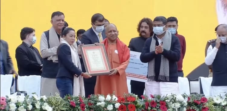 बता दें कि इस अवसर पर भारतीय भारोत्तोलन खिलाड़ी साइखोम मीराबाई चानू को 2021 में खेले गए टोक्यो ओलंपिक खेलों में 49 किग्रा वर्ग में रजत पदक जीतने पर सम्मानित किया गया. साथ ही, उन्हें 1.5 करोड़ रुपए का चेक सौंपकर योगी आदित्यनाथ ने सम्मानित किया. मणिपुर की रहने वालीं चानू भारत के लिये भारोत्तोलन में रजत पदक जीतने वाली प्रथम महिला हैं. सीएम योगी आदित्यनाथ ने खिलाड़ी मीराबाई का अपने भाषण में कई बार नाम लिया. इस अवसर पर चानू के कोच को भी सीएम ने दस लाख रुपए का चेक सौंपकर सम्मानित किया.