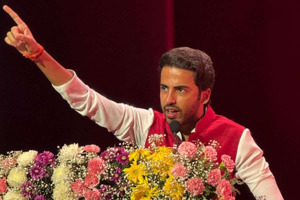मंच पर बरेली के मेयर उमेश गौतम के साथ जनसेवा का संकल्प लेते हुए पार्थ गौतम