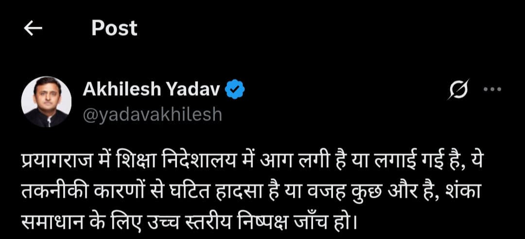 प्रयागराज में शिक्षा निदेशालय में आग लगी है या लगाई गई है, ये तकनीकी कारणों से घटित हादसा है या वजह कुछ और है, शंका समाधान के लिए उच्च स्तरीय निष्पक्ष जाँच हो.