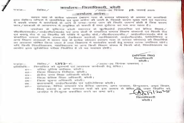 बरेली के जिलाधिकारी अविनाश सिंह ने आदेश जारी करते हुए सावन माह के हर सोमवार को जिले के स्कूलों और कॉलेजों में छुट्टी घोषित किया है. यह निर्णय कांवड़ यात्रा के दौरान यातायात और सुरक्षा व्यवस्था को ध्यान में रखते हुए लिया गया है.