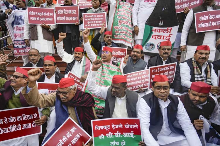 सोमवार को सुबह 10 बजे विपक्षी सपा सदस्य हाथों में सरकार विरोधी नारे लिखी तख्तियां लेकर विधान भवन के मुख्य द्वार पर पहुंचे और चौधरी चरण सिंह की प्रतिमा के समक्ष धरना दिया. सपा के विधानसभा और विधान परिषद सदस्यों ने हाथों में तख्तियां लहराते हुए कोडीन कफ सिरप के कथित अवैध कारोबार से जुड़े आरोपियों पर सख्त कार्रवाई की मांग की और सरकार पर कुछ लोगों को बचाने का आरोप भी लगाया.