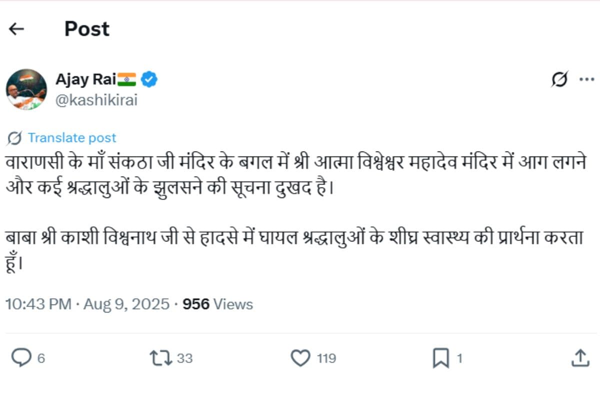 कांग्रेस नेता अजय राय ने सोशल मीडिया पोस्ट पर लिखा, “वाराणसी के मां संकठा जी मंदिर के बगल में श्री आत्मा विश्वेश्वर महादेव मंदिर में आग लगने और कई श्रद्धालुओं के झुलसने की सूचना दुखद है. बाबा श्री काशी विश्वनाथ जी से हादसे में घायल श्रद्धालुओं के शीघ्र स्वास्थ्य की प्रार्थना करता हूं.”