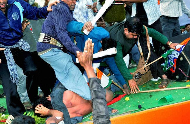 तभी मंच पर मौजूद अन्य लोगों ने उस युवक को घेर लिया और पीटने लगे. देखते ही देखते अन्य लोग भी मंच पर चढ़ गये और उसे बेरहमी से पीटने लगे. नाराज तृणमूल नेताओं व कार्यकर्ताओं ने पत्रकारों को भी पीटना शुरू कर दिया. कोलकाता टीवी के काजल बागची को बुरी तरह पीटा गया. उसकी हालत गंभीर बतायी जा रही है. वर्तमान अखबार के फोटोग्राफर चंद्र भानु बिजोली को भी पीटा गया. एबीपी आनंद के बीटन चक्रवर्ती को भी घेर लिया गया. सभी पत्रकार बचने के लिए वहां से कुछ ही कदम की दूरी पर थाने में पहुंचे लेकिन भीड़ वहां भी पहुंच गयी और पत्थर बरसाने लगी. थाने में भी तोड़फोड़ की गयी. थप्पड़ मारने वाले युवक को बचाने पहुंची पुलिस को भी पीटा गया. लोगों से बचने के लिए युवक मंच के नीचे चला गया वहां से उसे निकाल कर फिर पिटाई की गयी. मरणासन्न हालत में पुलिस ने पहले उसे चंडीपुर स्वास्थ्य केंद्र पहुंचाया और वहां से फिर तमलुक जिला अस्पताल में भरती कराया.