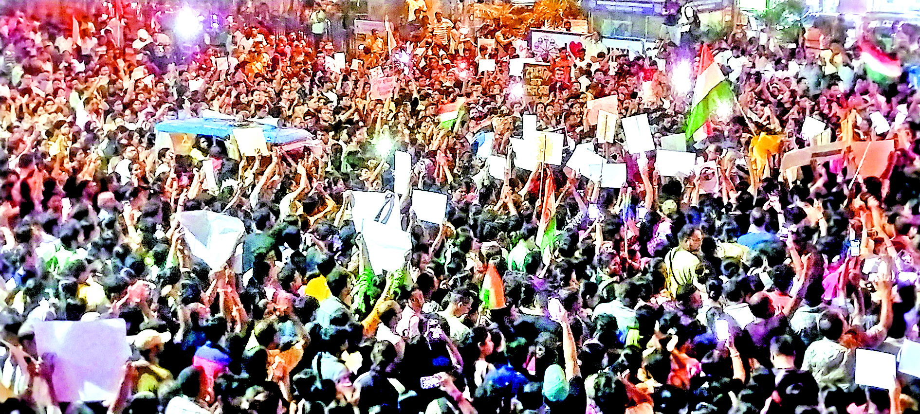 कोलकाता के आरजी कर मेडिकल कॉलेज एंड हॉस्पिटल परिसर में जूनियर महिला डॉक्टर कथित दुष्कर्म के बाद हत्या की घटना से पूरे देश में रोष है. खास कर डॉक्टरों और मेडिकल स्टूडेंट्स में. इसे लेकर स्वाधीनता दिवस से ठीक पहले बुधवार की आधी रात को लाखों महिलाएं कोलकाता और राज्य के अन्य इलाकों में सड़कों को उतर आयीं. जगह-जगह हजारों महिलाएं जुटीं और अभूतपूर्व तरीके सेे प्रदर्शन करते हुए रोष जताया. न्याय की मांग करते हुए ये ‘वी वांट जस्टिस – वी वांट जस्टिस’ जैसे नारे लगा रही थीं. प्रदर्शनकारी महिलाओं की भीड़ कहीं मशाल लेकर चल रही थी, तो कहीं मोमबत्ती. कहीं शंख ध्वनि से आसमान गूंज रहा था, तो कहीं गगनभेदी चीत्कार के साथ नारे गूंज रहे थे. प्रदर्शनकारियों की तादाद ऐसी कि कई जगह आधी रात का रोड ट्रैफिक भी बुरी तरह प्रभावित हुआ.