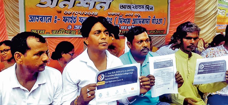 रानीगंज. रानीगंज के त्रिवेणी देवी भालोटिया (टीडीबी) कॉलेज में संथाली भाषा में स्नातक स्तर की पढ़ाई शुरू करने की मांग को लेकर ‘दिशम आदिवासी गांवता’ की तरफ से ‘फाइट फॉर मदर टंग’ के बैनर तले पिछले 24 दिनों से लगातार अनशन चलाया जा रहा था. राज्य सरकार के सरकारी पोर्टल पर इस खबर की पुष्टि की गयी है कि इसी शिक्षा वर्ष से रानीगंज के टीडीबी कॉलेज में संथाली भाषा में स्नातक स्तर की पढ़ाई शुरू हो जायेगी. इस खबर के आने के बाद प्रदर्शन और अनशन कर रहे आदिवासी समाज के लोगों में खुशी की लहर दौड़ गयी. सोमवार को इस अनशन को समाप्त कर दिया गया. अनशन करने वाले लोगों को आदिवासी समाज के माझी बाबा दुलाल टुडू, दिशम आदिवासी गांवता के राज्य सभापति लोबान हांसदा, सचिव रोबिन सोरेन एवं फाइट फॉर मदर टंग के राज्य सचिव सुकू हांसदा ने उन्हें जूस पिलाकर अनशन समाप्त कराया.