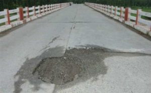 आसनसोल. : राष्ट्रीय राजमार्ग दो पर गारूई गांव के निकट अप लेन में सेनरेले रेलवे ओवर ब्रिज के दोनों किनारे और बीच में जगह जगह खाई बनकर ढ़लाई का सरिया बाहर निकल गया है. एनएचएआ अधिकारी अस्थायी मरम्मत के तौर पर गड्ढों की भराई सीमेंट व गिट्टी से करते हैं. लेकिन नियमित वाहन चलने से यह उखड़ जाता है. गड्ढ़े दिन-प्रतिदिन बढ़ते जा रहे हैं.