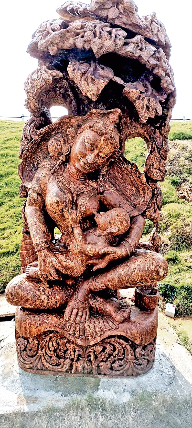 भारतीय सभ्यता में प्राचीन पत्थरों से बने धार्मिक स्थल एवं मूर्तियां आज भी अपनी गरिमा को दर्शाती हैं. प्राचीन पत्थरों से बनी स्मृतियों को देखने के लिए देश-विदेशों से सैलानी ऐसे स्थलों पर जाना पसंद करते हैं. ऐसी ही एक प्राचीन पत्थर से बनी मूर्ति आजकल दुर्गापुर में चर्चा का केंद्र बनी हुई है. यह मूर्ति शहर से लगे कमलपुर स्थित ओम्स ऑर्गेनिक गार्डेन में स्थापित की गयी है. मातृत्व प्रेम को दर्शाती इस मूर्ति के जरिये माता की गोद में शिशु को स्तनपान करते दर्शाया गया है. 10 फीट की यह मूर्ति ओड़िशा में पाये जानेवाले दुर्लभ लाल बलुई पत्थर से बनी है. भारतीय संस्कृति में लाल बलुई पत्थर का अहम स्थान है. इसी पत्थर से ओड़िशा में पवित्र कोणार्क सूर्य मंदिर और विश्वप्रसिद्ध जगन्नाथपुरी के मंदिर बनाये गये थे. इसकी खासियत यह है कि यह पत्थर किसी भी जलवायु अथवा, रासायनिक पदार्थ से क्षरित नहीं होता. सूत्रों की मानें, तो लाल बलुई पत्थर भारतीय इतिहास में 40 करोड़ वर्ष पुराना है. इस पत्थर का स्पर्श अथवा, दर्शन करना शुभ फलदायी माना जाता है. इस पत्थर से मातृत्व की मूर्ति गढ़ने का काम ओड़िशा के पद्मश्री मूर्तिकार प्रभाकर महाराणा ने किया है. उन्होंने एक वर्ष तक पहाड़ को काट कर लंबी कारीगरी के जरिये पत्थर की 10 फुट की प्रतिमा गढ़ी है.ओम्स ऑर्गेनिक गार्डेन के संरक्षक रामसेवक शाह ने बताया कि दुर्लभ पत्थर से बनी मूर्ति दुर्गापुर में पहुंच चुकी है. इसका निर्माण भुवनेश्वर में किया गया था. प्रतिमा की वजन 600 किलोग्राम होने के कारण इसे ओड़िशा से दुर्गापुर लाने में काफी दिक्कतें हुई थीं. लाल बलुई पत्थर से बनी मूर्ति को गार्डेन के ऊंचे पहाड़ पर विराजित किया गया है. उन्नत तकनीक का उपयोग कर बेस्ट लाइटिंग के साथ गोद में बैठ स्तनपान कर रहा नन्हा शिशु देखते ही बन रहा है. मूर्ति को देखने के लिए आसपास के शहरों से लोगों की भीड़ उमड़ रही है. मूर्ति लगाने का उद्देश्य प्राचीन पत्थर के महत्व से लोगों को अवगत कराना और गार्डेन को पर्यटन स्थल के तौर पर विकसित करना है.