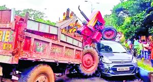 मंगलवार को हीरापुर थाना क्षेत्र के स्कॉब गेट के पास बर्नपुर जानेवाली सड़क पर बड़ा हादसा हो गया. ईंटों से लदे एक ट्रैक्टर ने तेज रफ्तार में पहले एक मोटरसाइकिल को ठोकर मारी, फिर सामने से आयी कार से भिड़ कर उसके ऊपर चढ़ गया. दुर्घटना में तीन लोग घायल हो गये. इस हादसे में कार के अंदर बैठे तीन लोग बाल-बाल बच गये. इस हादसे से आसपास अफरा-तफरी मच गया. घटना के तुरंत बाद आसपास के कुछ लोग घायलों की मदद को आगे आये. कार से घायलों को निकाल कर नजदीकी अस्पताल ले जाया गया. साथ ही मोटर साइकिल चालक आदित्य कुमार को भी अस्पताल ले जाया गया. ध्यान रहे कि स्कॉब गेट के पास गोल चौक के सामने सिंगल लेन है, जिससे वाहन गुजरते हैं. उसके बाद से डिवाइडर है. दुर्घटना सिंगल लेन में हुई है. स्थानीय पार्षद श्रावणी विश्वास ने बताया कि ट्रैक्टर ने पहले सामने से आ रही एक मोटरसाइकिल को जोरदार टक्कर मारी. उसके बाद बेकाबू होकर ट्रैक्टर के इंजन का बड़ा हिस्सा सामने से आ रही कार पर चढ़ गया. हादसे में घायल लोगों को तुरंत स्थानीय लोगों व राहगीरों ने इलाज के लिए नजदीकी अस्पताल में भर्ती कराया. इस घटना के कारण सड़क पर कुछ समय के लिए यातायात पूरी तरह ठप हो गया. वाहनों की लंबी कतार लग गयी. ट्रैफिक पुलिस ने मौके पर पहुंच कर ट्रैक्टर को हटाया और यातायात को सामान्य किया. स्थानीय सूत्रों के अनुसार, हादसे के बाद ट्रैक्टर चालक मौके से फरार हो गया. उसे पुलिस तलाश रही है.एक प्रत्यक्षदर्शी के मुताबिक सुबह करीब 10:30 बजे चित्रा मोड़ की तरफ जा रहे ट्रैक्टर ने स्कॉब गेट के सामने एक बाइक चालक को टक्कर मार दी और अनियंत्रित होकर कार पर चढ़ गया. इस दुर्घटना में बाइक चालक के कान से खून निकल रहा था और पैर में फ्रैक्चर हुआ है. कार में सवार सभी लोगों को सुरक्षित बाहर निकाल लिया गया था. लेकिन कार में सवार एक व्यक्ति को गंभीर रूप से चोट लगी है. घायलों को इलाज के लिए नजदीकी अस्पताल में दाखिल कराया गया है. उधर, पुलिस थाने में मामला दर्ज कर ट्रैक्टर चालक की तलाश में लग गयी है. इस हादसे ने स्थानीय लोगों में आक्रोश पैदा कर दिया है. स्थानीय लोगों का कहना है कि इस मार्ग पर अक्सर भारी वाहनों की लापरवाही के कारण ऐसी घटनाएं होती रहती हैं. प्रशासन से मांग की जा रही है कि सड़क सुरक्षा के लिए कड़े कदम उठाये जायें, ताकि भविष्य में ऐसी घटनाएं रोकी जा सकें.