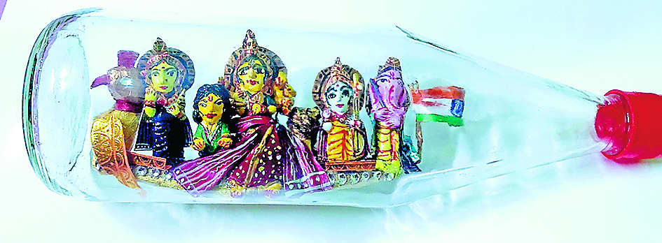 कलाकार ने बताया कि उन्होंने 11 इंच की सॉस बोतल के भीतर 6×2 इंच की मूर्ति तैयार की. इसके लिए मिट्टी, चिकनी मिट्टी, पेंट, कपास और एक पतले तार का इस्तेमाल किया गया. तार की मदद से छोटे से मुंह से प्रतिमा के हिस्से बनाये गये. इस कलाकृति को तैयार करने में करीब एक महीने का समय लगा.