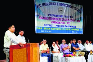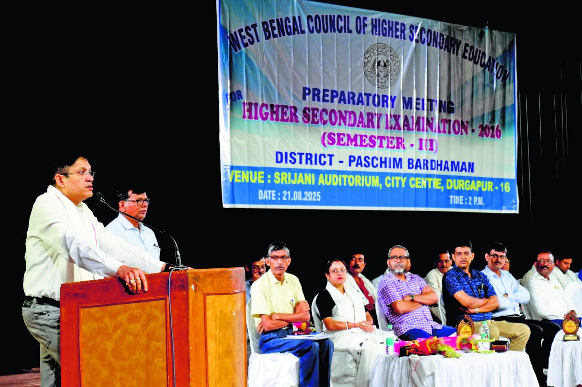 दुर्गापुर. गुरुवार को सिटी सेंटर स्थित सृजनी सभागार में उच्च माध्यमिक परीक्षा 2026 (सेमेस्टर-3) की तैयारी को लेकर जिला स्तरीय बैठक हुई, जिसमें मुख्य वक्ता के रूप में वेस्ट बंगाल काउंसिल ऑफ हायर सेकेंडरी एजुकेशन (डब्ल्यूबीसीएचएसइ) के अध्यक्ष प्रोफेसर डॉ चिरंजीब भट्टाचार्य और सचिव डॉ प्रियदर्शिनी मलिक उपस्थित रहे. साथ ही काउंसिल की जिला परामर्श समिति के सदस्य, सेंटर इंचार्ज, सेंटर सेक्रेटरी, वेन्यू सुपरवाइजर तथा जिले के सभी उच्च माध्यमिक विद्यालयों के प्रधानाध्यापक व प्राचार्य भी शामिल हुए.