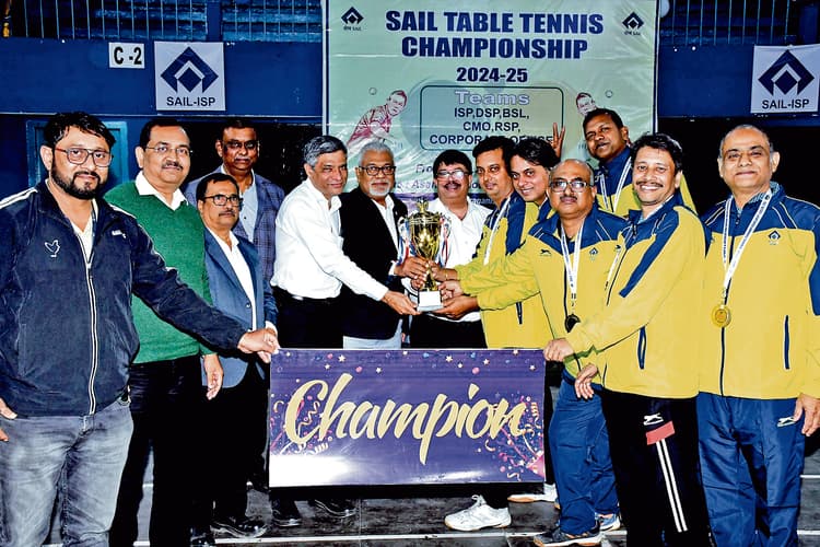 सेल आइएसपी के स्पोटर्स एंड रीक्रिएशन विभाग की ओर से आसनसोल इंडोर स्टेडियम में तीन दिवसीय सेल एमप्लॉइज टेबल टेनिस टूर्नामेंट-2024 में डीेएसपी की टीम चैंपियन रही. इसमें सेल के विभिन्न यूनिट सीएमओ, आरएसपी, आइएसपी, डीएसपी, बीएसएल के खिलाड़ियों ने हिस्सा लिया था. यहां पर रोमांचक मैच देखने को मिला. फाइनल में डीएसपी की टीम ने इंटर सेल टीटी टूर्नामेट में खिताब अपने नाम किया. मौके पर इडी (प्रोजेक्ट) सुरजीत सिंह, इडी (एचआर) यूपी सिंह, इडी (एमएम) अभीक दे, इडी (वर्क्स) दीपेंदु घोष, स्पोटर्स एंड रीक्रिएशन विभाग के अधिकारी संजय सिन्हा आदि मौजूद थे. विजेता टीम को चैंपियन ट्रॉफी दी गयी.डिस्क्लेमर: यह प्रभात खबर समाचार पत्र की ऑटोमेटेड न्यूज फीड है. इसे प्रभात खबर डॉट कॉम की टीम ने संपादित नहीं किया है