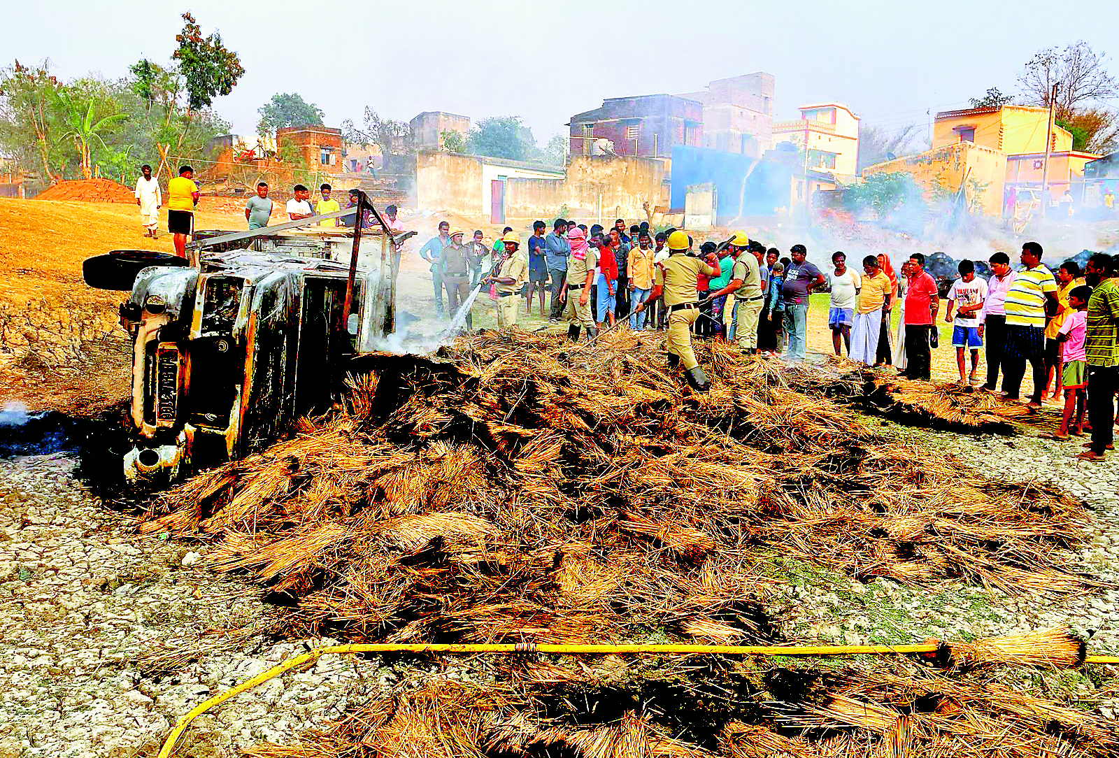 सोमवार को दोपहर जिले के टामना थाना क्षेत्र के चांकदा गांव में पुआल से लदे पिकअप वैन में अचानक आग लगने से अफरा-तफरी मच गयी. पुआल लाद कर पिकअप वैन चांकदा गांव से पालोंदा गांव की ओर जा रहा था. गांव से निकलते ही पिकअप वैन में लदे पुआल में आग लग गयी. इसका पता चलते ही चालक तत्परता दिखाते हुए पिकअप वैन को लेकर चालक गांव गांव से कुछ दूर मैदान में चला गया. फिर वह गाड़ी से उतर गया. घटना की सूचना दमकल विभाग को दी गयी, फिर एक इंजन के साथ दमकलवाले जब वहां पहुंचे, तब तक सारी पुआल जल गयी थी. हालांकि दमकलकर्मियों ने आग बुझा दी. दमकल अधिकारी का प्राथमिक अनुमान है कि पिकअप वैन पर लदी पुआल से बिजली का नंगा तार छुआने से आग लगी होगी. घटना की छानबीन की जा रही है.डिस्क्लेमर: यह प्रभात खबर समाचार पत्र की ऑटोमेटेड न्यूज फीड है. इसे प्रभात खबर डॉट कॉम की टीम ने संपादित नहीं किया है