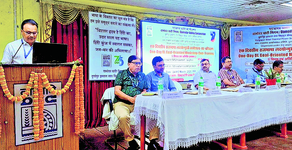 राजभाषा हिंदी के प्रगामी प्रयोग में अभिवृद्धि हेतु आंतरिक प्रशिक्षण कार्यक्रम के तहत दामोदर घाटी निगम, दुर्गापुर इस्पात ताप विद्युत केन्द्र, अंडाल में एक पूर्ण दिवसीय राजभाषा लक्ष्योन्मुखी कार्यशाला-सह-प्रशिक्षण (नाराकास स्तरीय) का आयोजन दिव्यज्योति भवन स्थित ट्रेनिंग हॉल में किया गया, प्रशिक्षण कार्यक्रम में डीएसटीपीएस, डीवीसी के 21 अनुभागों तथा नराकास, दुर्गापुर के 23 सदस्य संस्थानों से कुल 75 अधिकारियों एवं कर्मचारियों ने प्रशिक्षण प्राप्त किया,दो विषयों यथा – ‘संसदीय राजाभाषा निरीक्षण प्रश्नावली : एक दृष्टि में’ तथा ‘शुद्ध लेखन की ओर: हिंदी मानकीकरण एवं वर्तनी दोष निवारण’ के अंतर्गत प्रशिक्षण प्रदान किया गया. कार्यशाला-सह-प्रशिक्षण कार्यक्रम के मुख्य अतिथि श्री राम प्रवेश साह, वरिष्ठ महाप्रबंधक एवं परियोजना प्रधान, विशिष्ट अतिथि- वरिष्ठ महाप्रबंधक (ओ व एम) सुधीर कुमार व्यास, वरिष्ठ महाप्रबंधक (एसएचएमएस) सुकदेव खाँ, महाप्रबंधक अरिजीत मजुमदार, पंकज कुमार सिंह, सदस्य-सचिव, नराकास, दुर्गापुर एवं उप महाप्रबंधक (मा.सं.- एल एवं ए, खेल व राजभाषा), दुर्गापुर स्टील प्लांट तथा अतिथि प्रवक्ता – डॉ. नन्द किशोर पंडित, सहायक प्राध्यापक, हिंदी विभाग, एपीएसएम कॉलेज बरौनी और श्री दीपक साव, हिंदी प्राध्यापक, हिंदी शिक्षण योजना, आसनसोल केंद्र, राजभाषा विभाग, भारत सरकार ने संयुक्त रूप से सद्भावना मंगलदीप प्रज्ज्वलित किया। सदस्य सचिव सहित दोनों अतिथि प्रवक्ताओं को उत्तरीय ओढ़ाकर एवं हरी पौध व राजभाषा प्रशस्ति -फलक प्रदान कर सम्मानित किया गया तदुपरांत महाप्रबंधक अरिजीत मजुमदार ने स्वागत भाषण दिया और राजभाषा विभाग, गृह मंत्रालय, भारत सरकार की “राजभाषा प्रतिज्ञा ” के साथ सबको शपथ दिलवायी .उद्घाटन सत्र को संबोधित करते हुए मुख्य अतिथि एवं परियोजना प्रधान राम प्रवेश साह ने समस्त अधिकारियों व कर्मचारियों को अपनी शुभकामनाएँ दीं उन्होंने कहा कि हिंदी हमारे जीवन मूल्यों एवं संस्कारों को दर्शाने वाली भाषा है जिसके दामन में सभी भारतीय भाषाओं का समान आदर है विद्युत उत्पादन के साथ ही साथ डीएसटीपीएस राजाभाषा हिंदी के प्रचार-प्रसार के प्रति भी सजग है नराकास, दुर्गापुर पूरी दुर्गापुर नगरी को जोड़कर एक प्लाटफ़ार्म पर सँजोये हुए है. उन्होंने अपील की कि एक तरफ हमें हिंदी के शुद्ध लेखन की ओर विशेष ध्यान देना है तो दूसरी तरफ संसदीय राजाभाषा निरीक्षण प्रश्नावली के प्रति भी सदैव सचेष्ट रहना है वरिष्ठ महाप्रबंधक सुधीर कुमार व्यास ने अपने संबोधन में कहा कि शिक्षण-प्रशिक्षण के साथ-साथ बोलने और लिखने में भी हमें हिंदी का दैनिक उपयोग करना चाहिए नराकास सदस्य सचिव पंकज कुमार सिंह ने अपना उद्गार