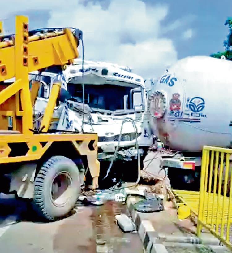 बर्दवान/पानागढ़. बुधवार को सुबह पूर्व बर्दवान के बर्दवान बाइपास स्थित दामोदर कोल्ड स्टोरेज के पास कोलकाता जा रही सरकारी बस ने एक बाइक को ठोकर मार दी, जिससे उसके चालक की मौके पर ही मौत हो गयी. फिर वहीं एक डंपर और गैस टैंकर में भी टक्कर हो गयी, जिसमें दोनों गाड़ियों के चालक बुरी तरह जख्मी हो गये. घटना के बाद स्थानीय लोगों और दमकल व पुलिस के जवानों ने मिल कर घायलों को क्षतिग्रस्त वाहन से बाहर निकाला और नजदीकी अस्पताल में भर्ती कराया. बताया गया है कि कोलकाता जा रही सरकारी यात्री बस तेज गति में बाइकर को धक्का मारते हुए आगे निकल गयी. हादसे में मौके पर ही बाइकर की मौत हो गयी. हादसे के ठीक बाद पीछे से आये गैस टैंकर और एक डंपर भी बेकाबू होकर एक-दूसरे से भिड़ गये. इसमें दोनों वाहन के चालक बुरी तरह जख्मी हो गये. घायलों की हालत अस्पताल में नाजुक बतायी जा रही है. मृतक के शव को कब्जे में लेकर पुलिस ने ऑटोप्सी के लिए सरकारी अस्पताल भेज दिया है.