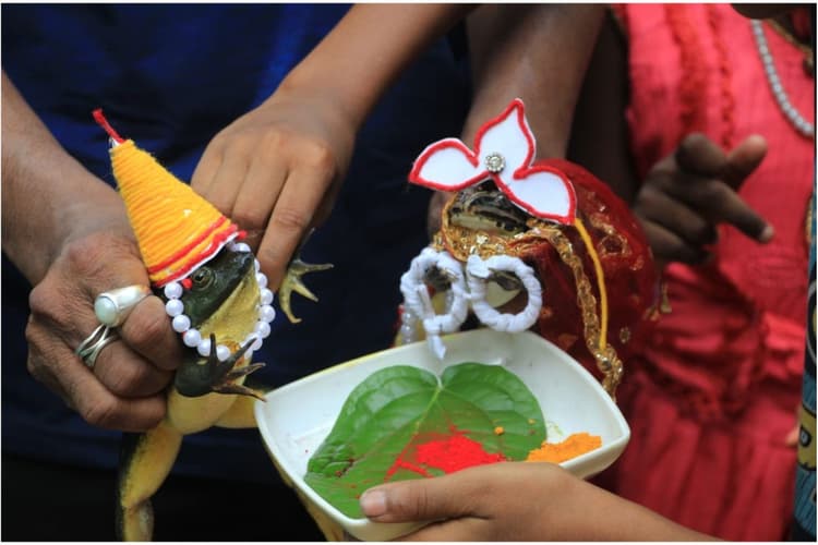 हाबरा, विकास कुमार गुप्ता : इन दिनों लगातार बढ़ रही गर्मी से एक तरफ आम जनता तो दूसरी तरफ हमारे अन्नदाता किशान परेशान हैं. यही नहीं, लगातार अपने ही रिकार्ड को तोड़ रही झुलसा देनेवाली गर्मी से स्कूली बच्चे भी त्रस्त हैं. इन सभी के बीच गर्मी से राहत पाने लिए बारिश की कामना लेकर पश्चिम बंगाल की राजधानी कोलकाता से करीब 50 किलोमीटर दूर उत्तर 24 परगना जिले के हाबरा में स्थित कुमड़ा काशीपुर में स्कूली बच्चों के साथ उनके अभिभावकों ने मेंढक एवं मेंढकी का विवाह करवाया. इस विवाह समारोह में एक तरफ बड़ी संख्या में गांव के लोग व बच्चे तो दूसरी तरफ करीब दर्जन भर मेंढक बाराती के तौर पर मौजूद थे.