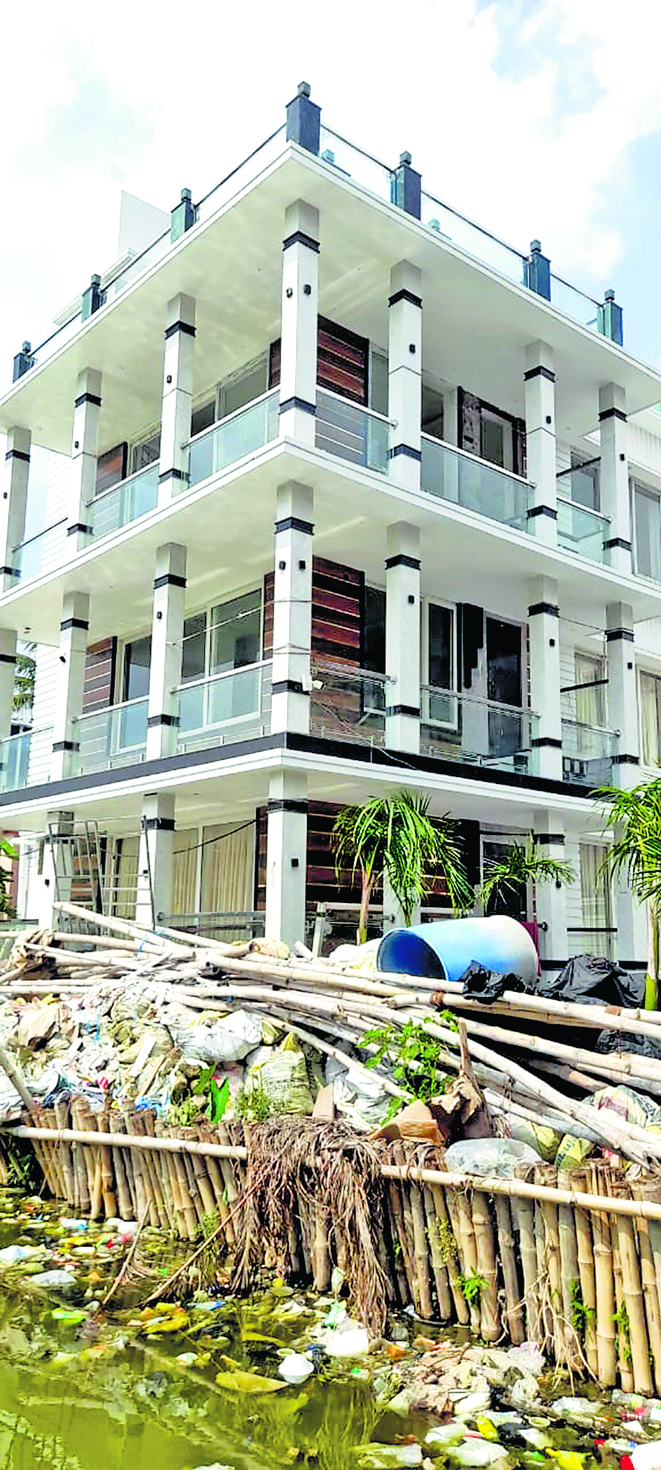 मकान के एक तरफ तालाब के एक हिस्से को रेत की बोरियों और पत्थर के टुकड़ों से भरा गया है और पास में जयंत का आलीशान तीन मंजिली इमारत है, हालांकि जयंत के भाई का दावा है कि जयंत का उस मकान के बनाने में ज्यादा योगदान नहीं है. वह अपनी कमाई अपने पर ही खर्च करता था.