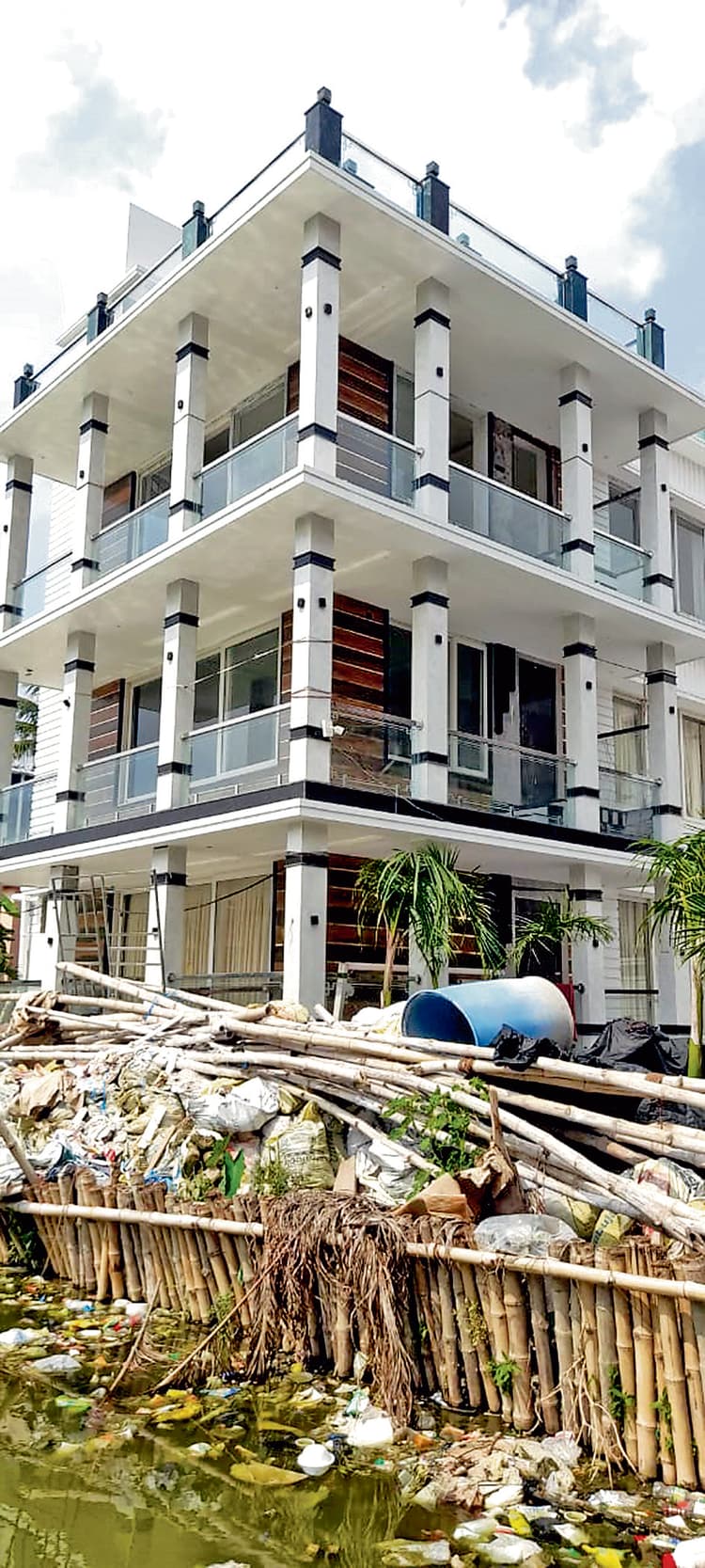 मकान के एक तरफ तालाब के एक हिस्से को रेत की बोरियों और पत्थर के टुकड़ों से भरा गया है और पास में जयंत का आलीशान तीन मंजिली इमारत है, हालांकि जयंत के भाई का दावा है कि जयंत का उस मकान के बनाने में ज्यादा योगदान नहीं है. वह अपनी कमाई अपने पर ही खर्च करता था.