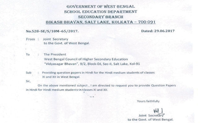 शिक्षा विभाग के संयुक्त सचिव ने पश्चिम बंगाल उच्च माध्यमिक शिक्षा परिषद के चेयरमैन महुआ दास को 29 जून, 2017 को इस बाबत पत्र लिखा है. पत्र संख्या 528-एसइ/एस/10एम-65/2017 में पश्चिम बंगाल के 11वीं व 12वीं के हिंदी माध्यम के छात्रों को हिंदी में प्रश्न पत्र उपलब्ध कराने का निर्देश दिया गया है. इसमें हिंदी माध्यम के छात्रों को हिंदी में प्रश्न पत्र देने का आदेश दिया गया है.
