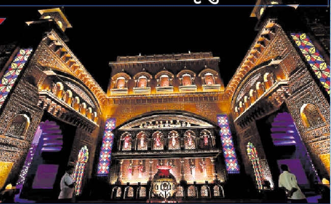 कोलकाता : चेतला के अग्रणी पंडाल में इस वर्ष जन्म से मृत्यु तक की प्रक्रिया पंडाल के दीवारों पर बनी कलाकारी द्वारा दर्शाया गया है. पंडाल में दाखिल होते ही भ्रूण में बच्चे के पलने की प्रक्रिया, विशाल महल के रूप में पंडाल है, जिसमें यह दर्शाया गया है कि पूरे जीवनभर मनुष्य रुपयों को इकट्ठा करता है. बड़े घर की ख्वाहिश करता है, पर अंत में सभी को विसर्जित ही हो जाना होता है.