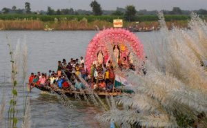 दशमी के अनुष्ठानों के बाद मिट्टी निर्मित देवी दुर्गा की मूर्तियों को भव्य तरीकों से सजाये गये पंडालों और घरों से नदियों और अन्य जलाशयों में विसर्जन के लिए ले जाया गया.